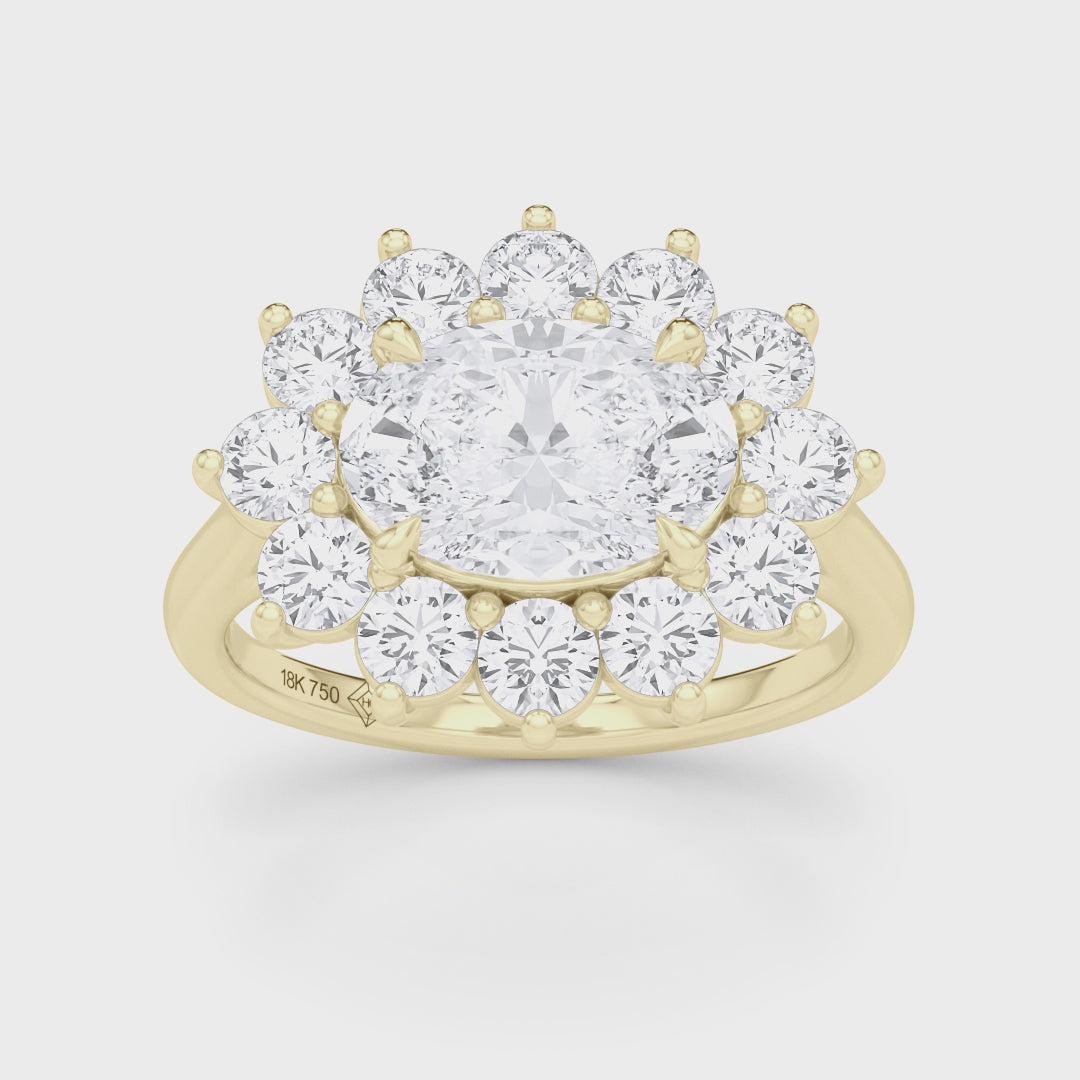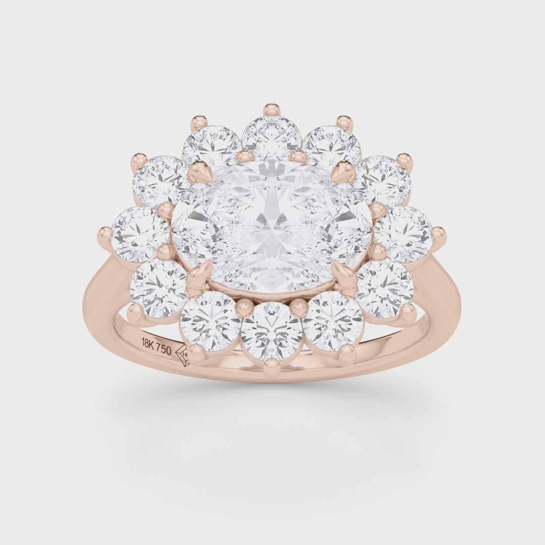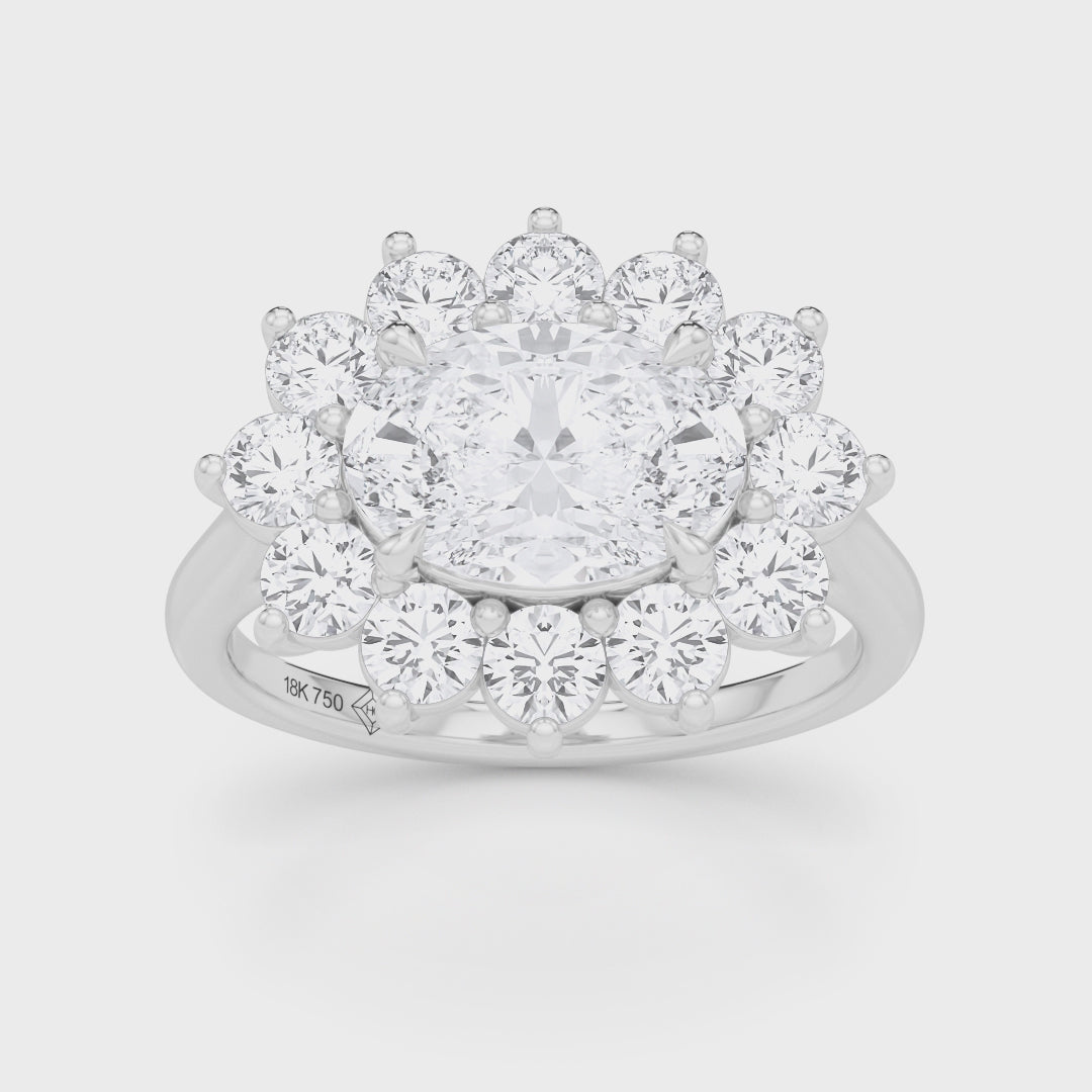 A romantic reimagining of classic elegance, this East-West Princess Ring features a luminous oval center stone set in a unique horizontal orientation. Framed by a delicate floral motif of round diamonds, it captures the feeling of timeless love in bloom. Whether worn as an engagement ring, cocktail ring, statement piece, or a bold pinky ring, it’s made for those who aren’t afraid to shine in their own unforgettable way.