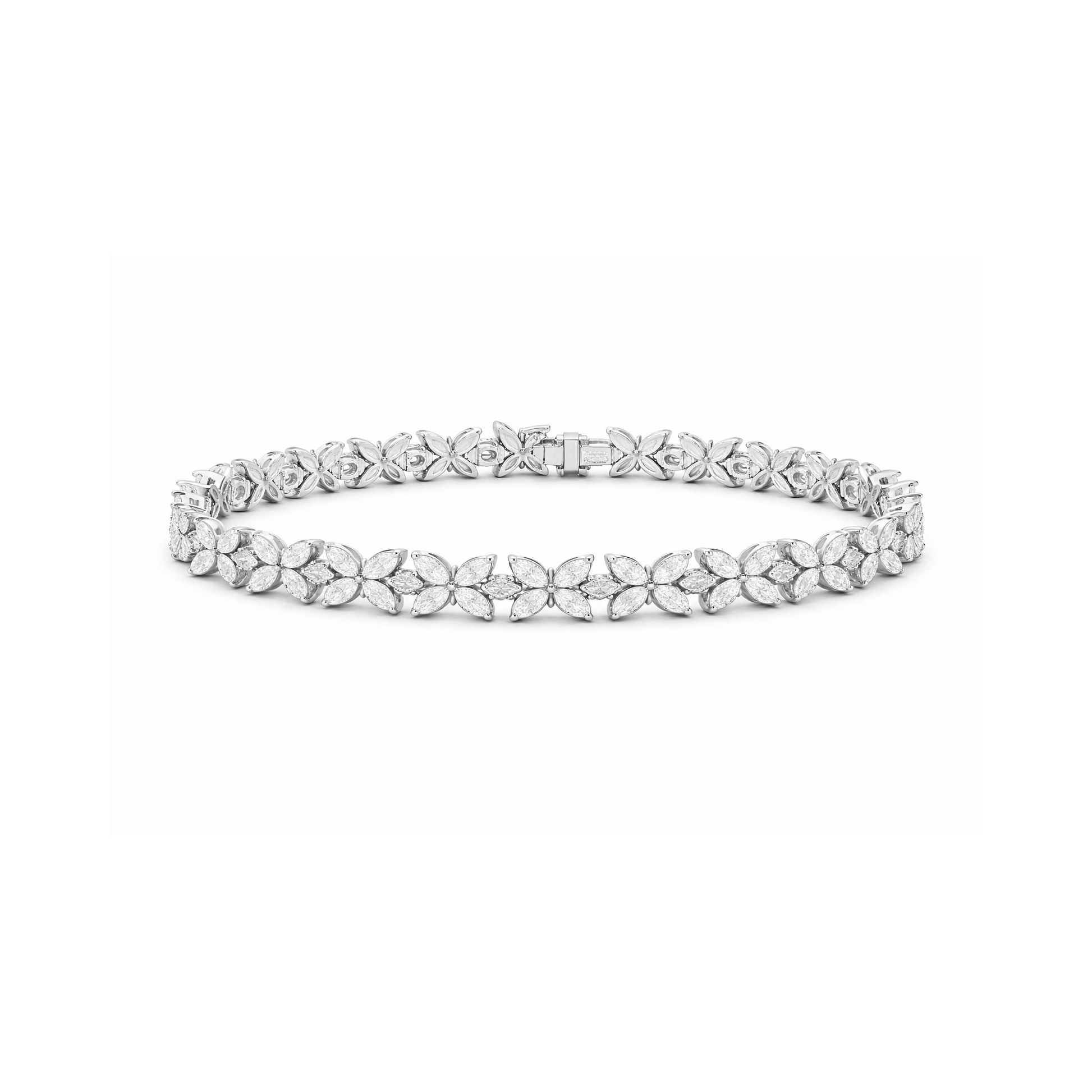 The marquise was made for this moment. Its elongated curves and pointed tips scatter light with every turn of the wrist, not the steady shimmer of a classic tennis bracelet, but something more alive.