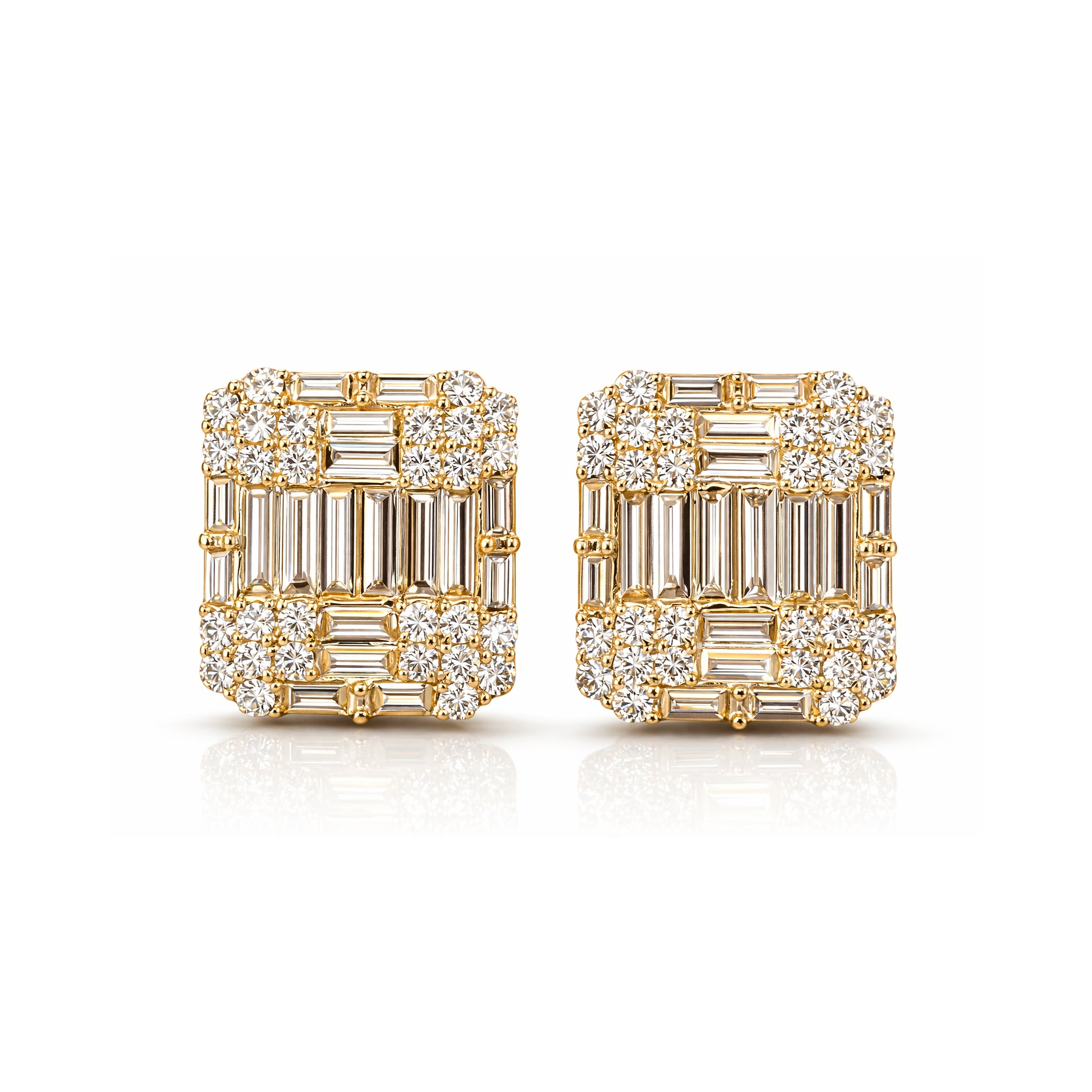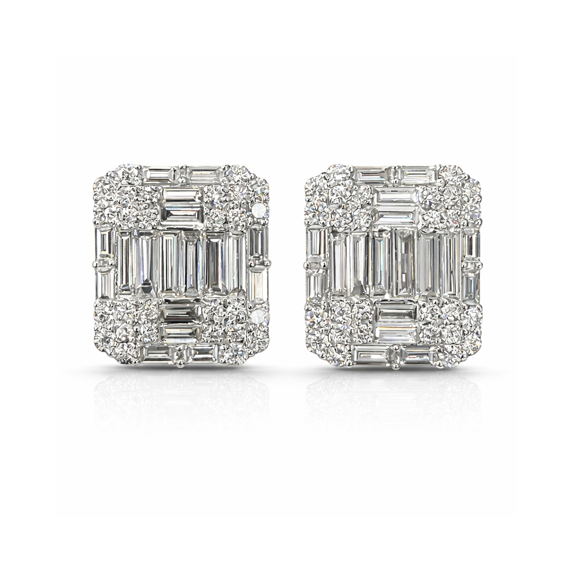 This is not a cluster earring. It is a composition, every baguette placed with the intention of a single, unified surface of light. The straight-edged precision of the baguettes creates the illusion's sharp geometry, while the round brilliants at the perimeter soften the silhouette and flood the piece with the continuous sparkle that only a brilliant cut produces. Two diamond cuts, one vision, a result that wears with the quiet authority of something far larger than its setting suggests.