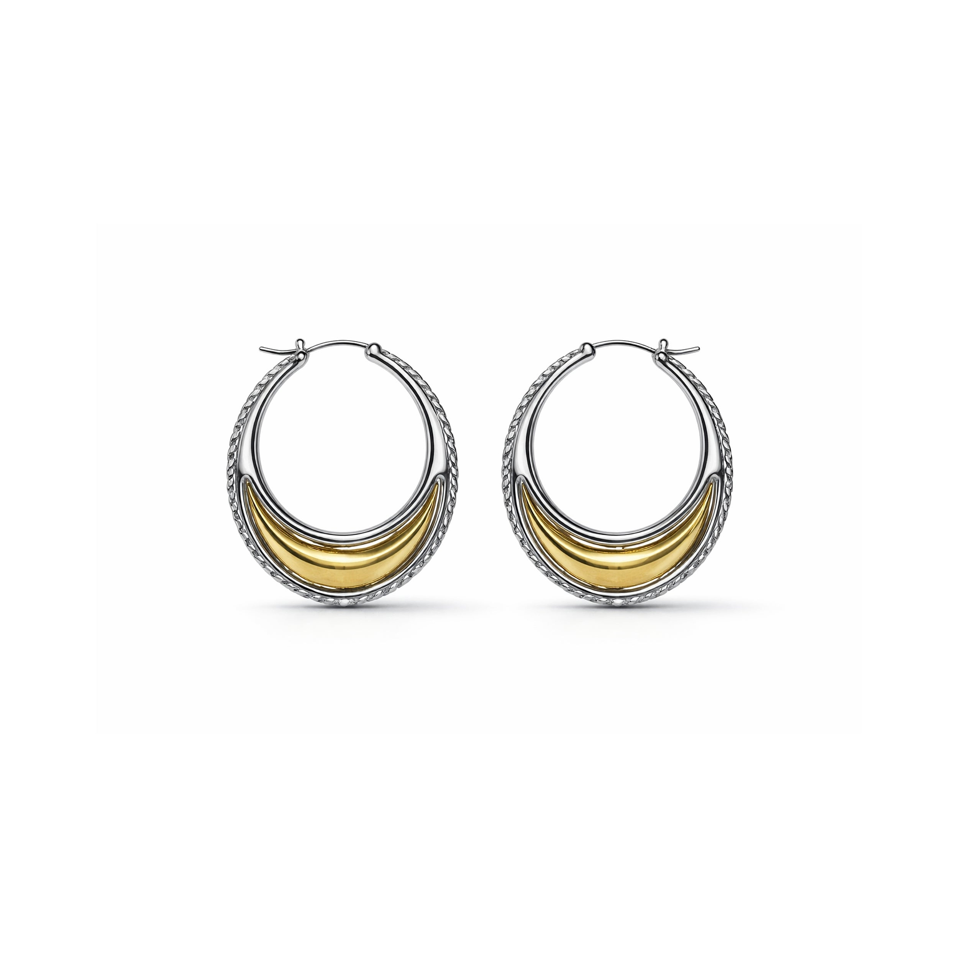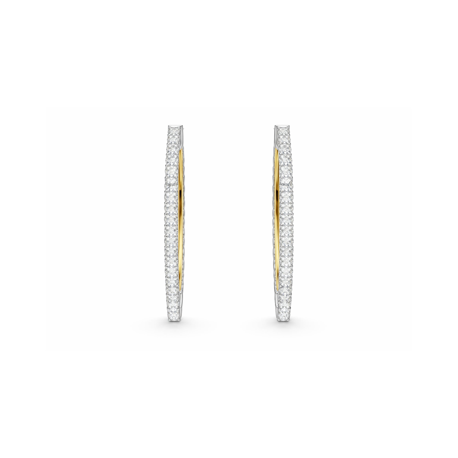 A celebration of contrast, with a softly sculpted gold curve hidden within. The dual-metal design creates a subtle play of light and shadow, revealing itself gradually as the earrings move. Each hoop is set with a vertical current of approximately fifty diamonds.